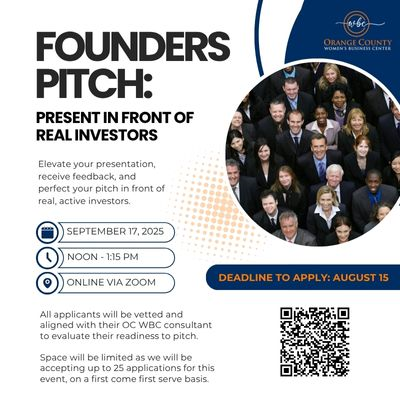 Founders Pitch: Present in Front of Real Investors is a high-impact opportunity for early-stage entrepreneurs to pitch their business ideas directly to a panel of real, active investors. Hosted by the Orange County Women’s Business Center (OC WBC), this virtual event is designed to help you elevate your presentation, receive valuable feedback, and gain visibility with potential funders.